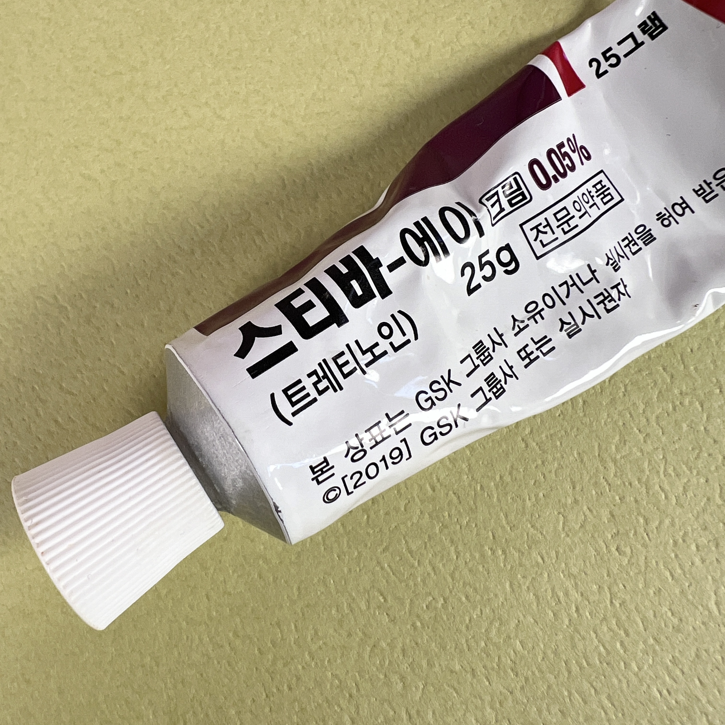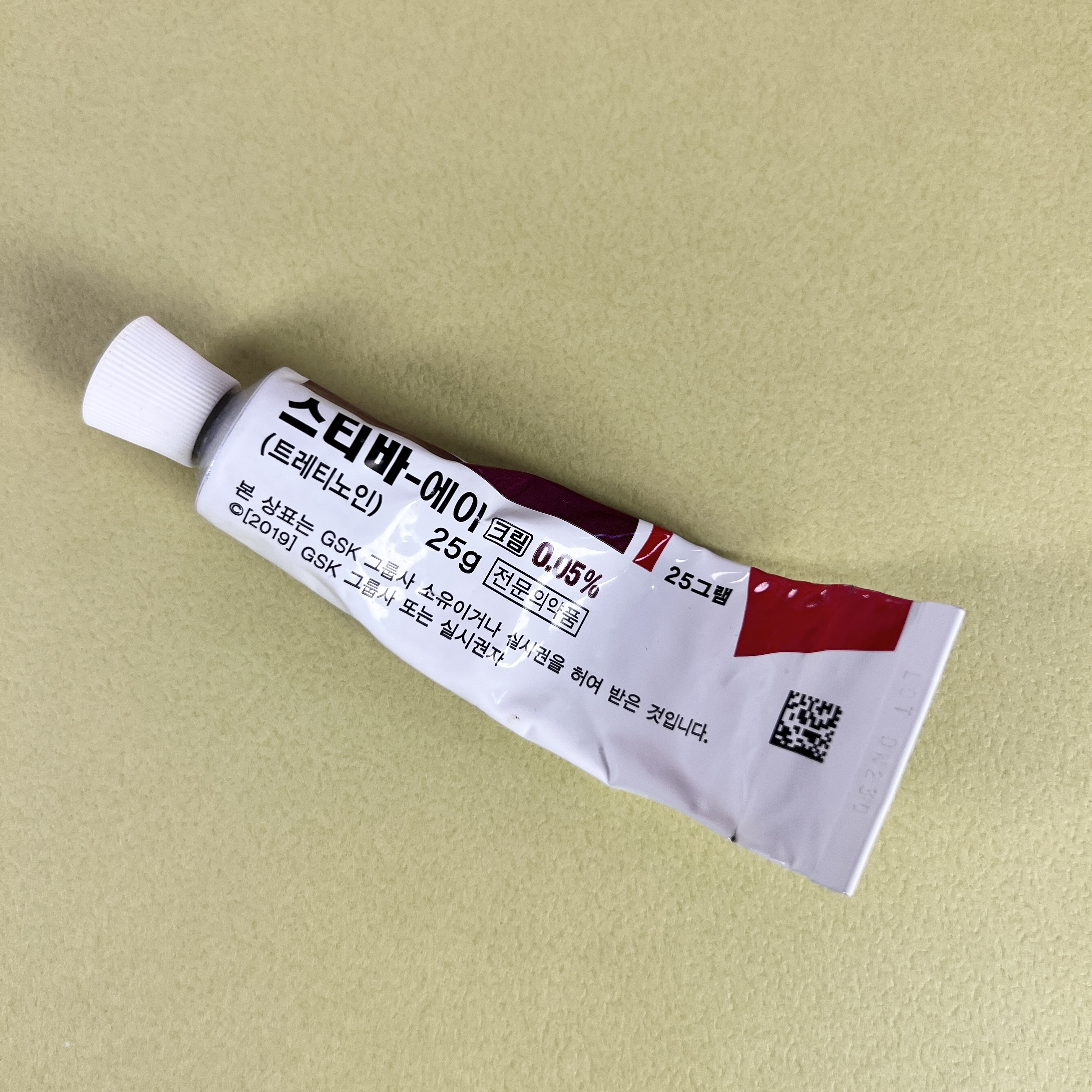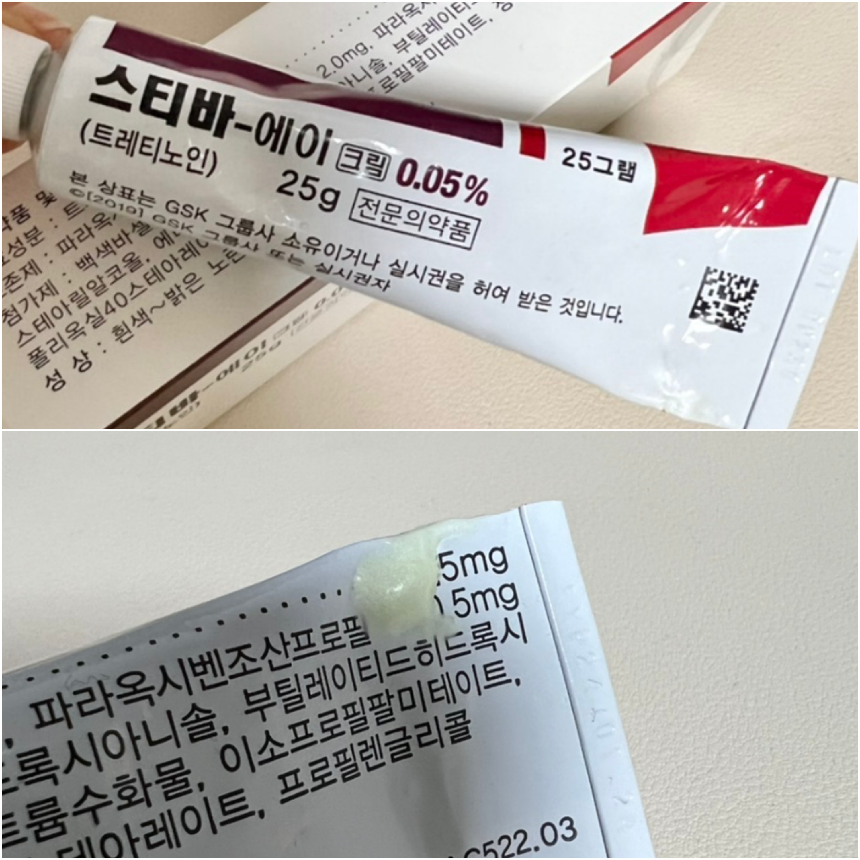 처방 과정: 피부과에서 스티바A 0.025%를 처방받았으나, 약국에서 품절로 인해 0.05%를 사용하게 되었습니다. 처음 사용한 0.025%도 강력한 제품이었지만, 더 높은 농도의 제품을 사용하게 되어 긴장감이 있었습니다.